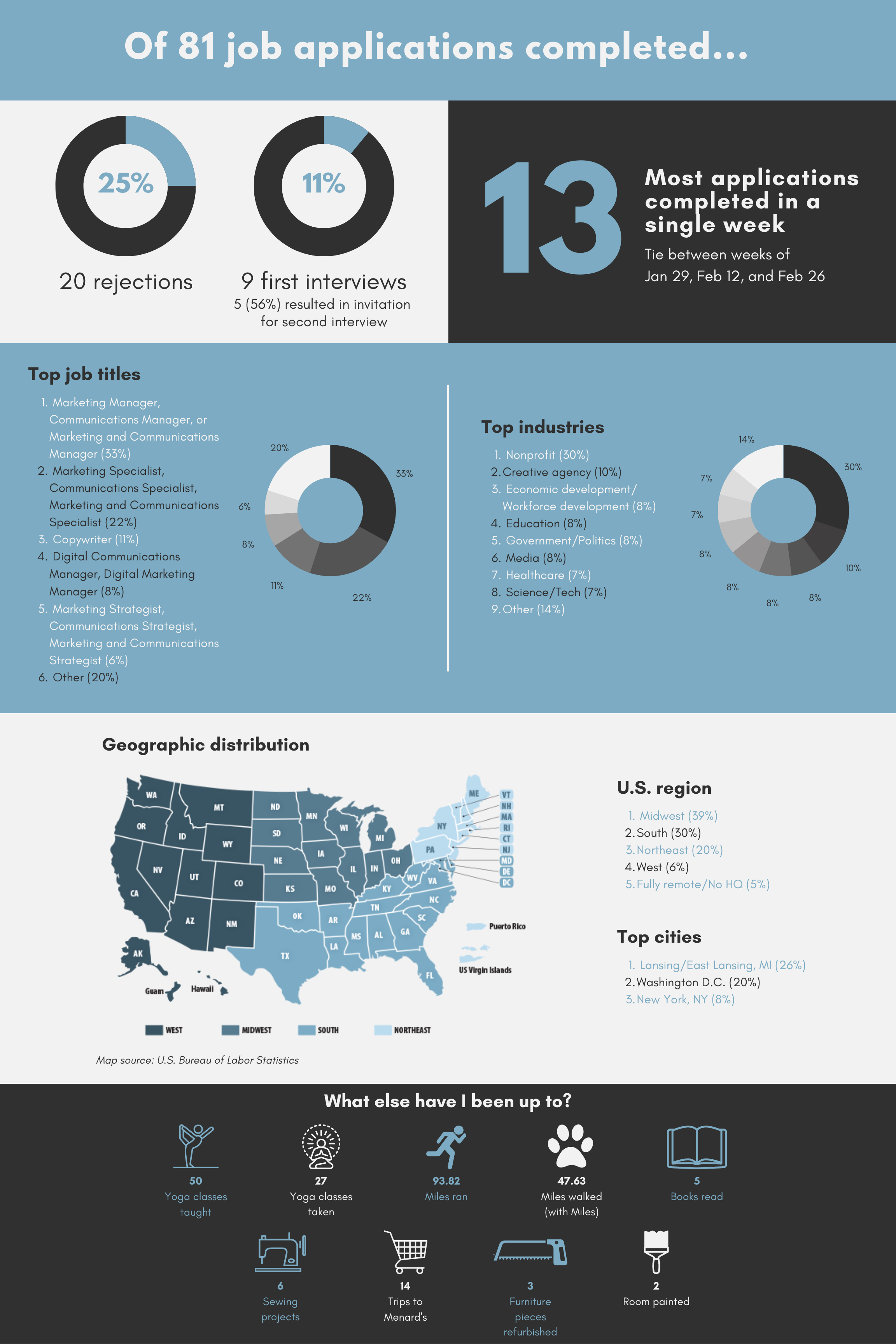 My advice (if you’re asking for it) is to find a way to create purpose and interest for yourself within, or outside, of your search. Find ways to explore your identity and passions outside of your career (like how I learned I’m pretty good at refinishing furniture!) and try to find ways to detach from the emotional nature of putting yourself out there, again and again, when job searching. For me, that was stepping out of the creative and persuasive energy needed to write a good cover letter, and turning to the objectivity of numbers and trends.